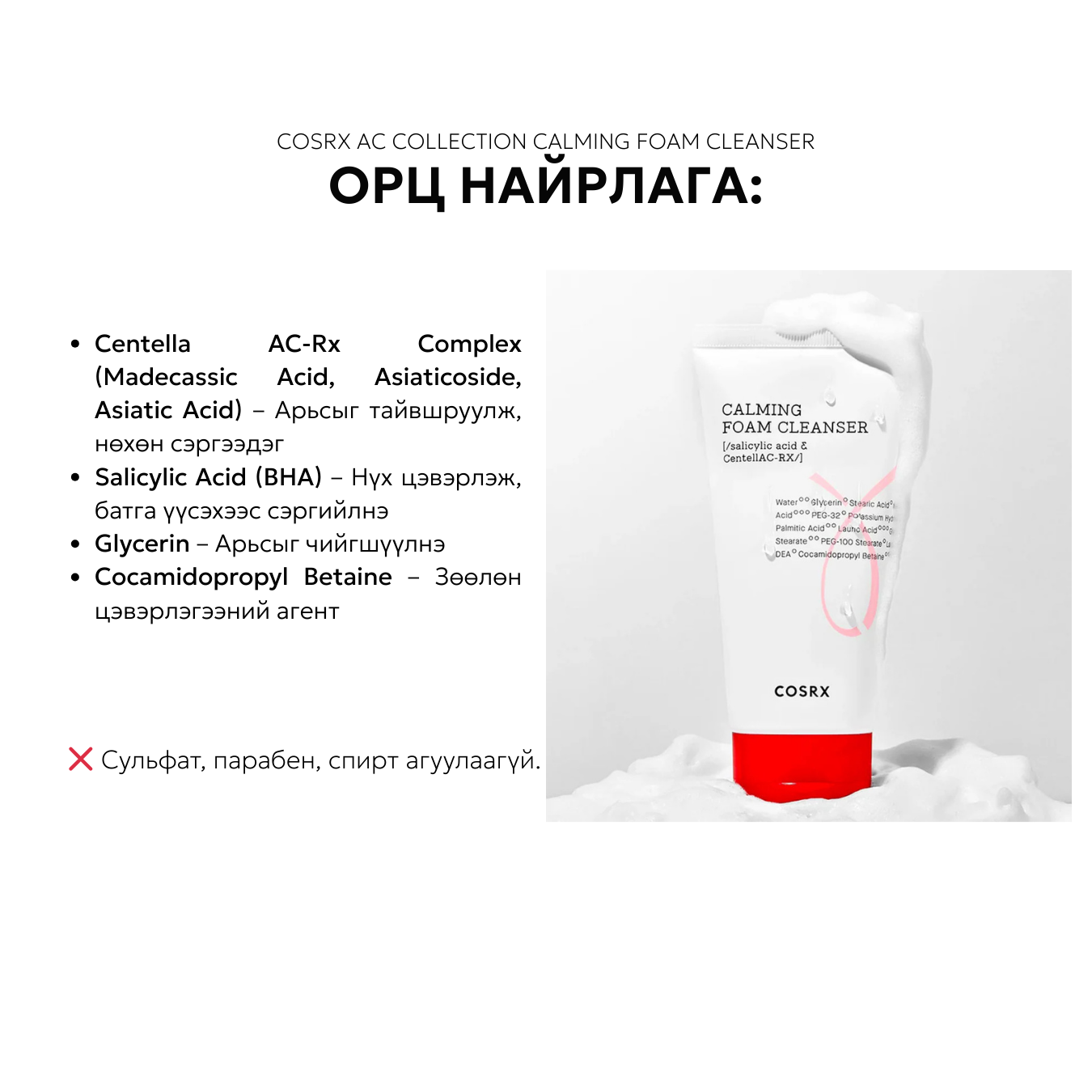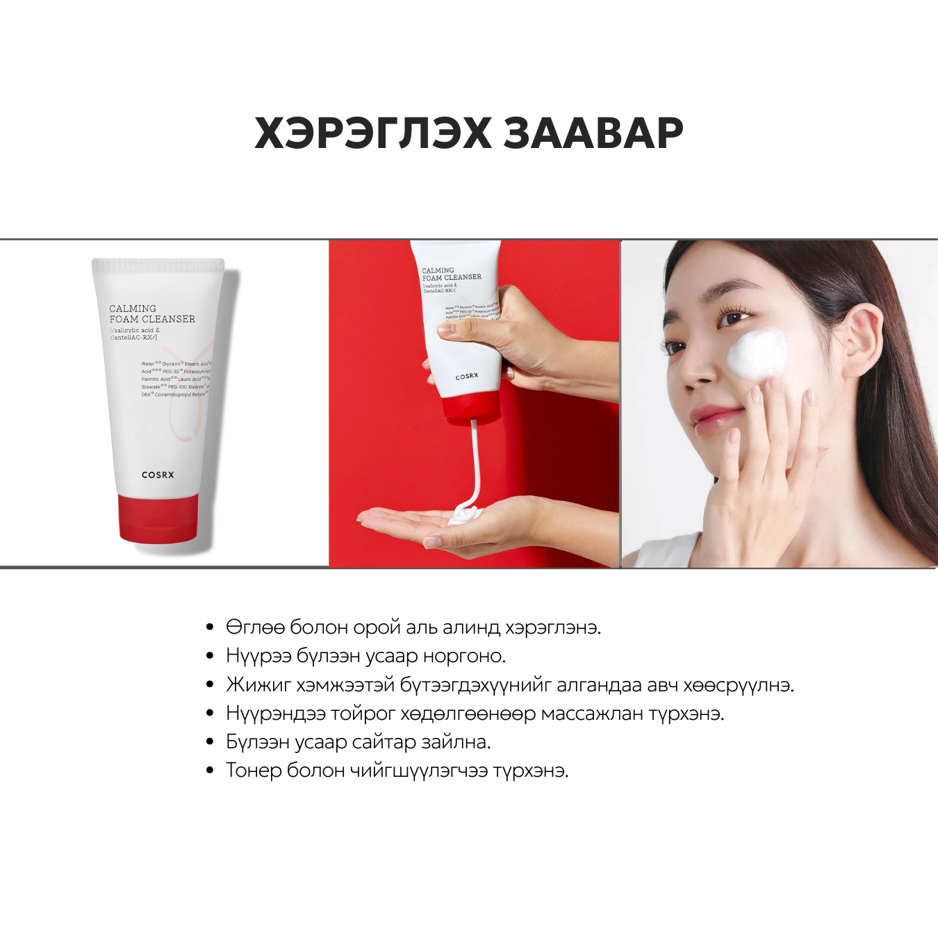 Тайвшруулагч зөөлөн хөөс нь арьсны бохирдол, тос, үхэжсэн эсийг зөөлөн цэвэрлэж, тайвшруулдаг.
