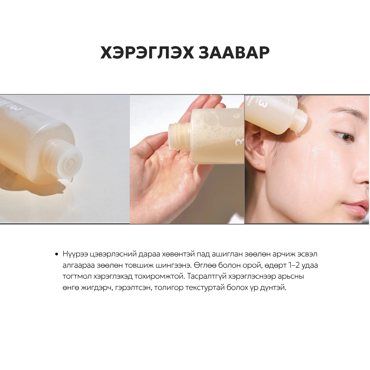 1. Нүүрээ цэвэрлэсний дараагаар алгандаа зохих хэмжээг авч шавшиж хэрэглэх ба түрхсэн хэсгүүддээ алгаараа зөөлөн дарж, дулаан хэмд нь бүр гүн шингээнэ.