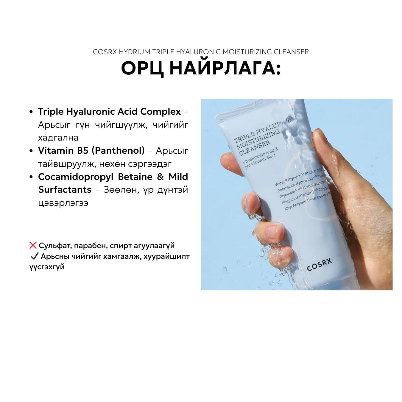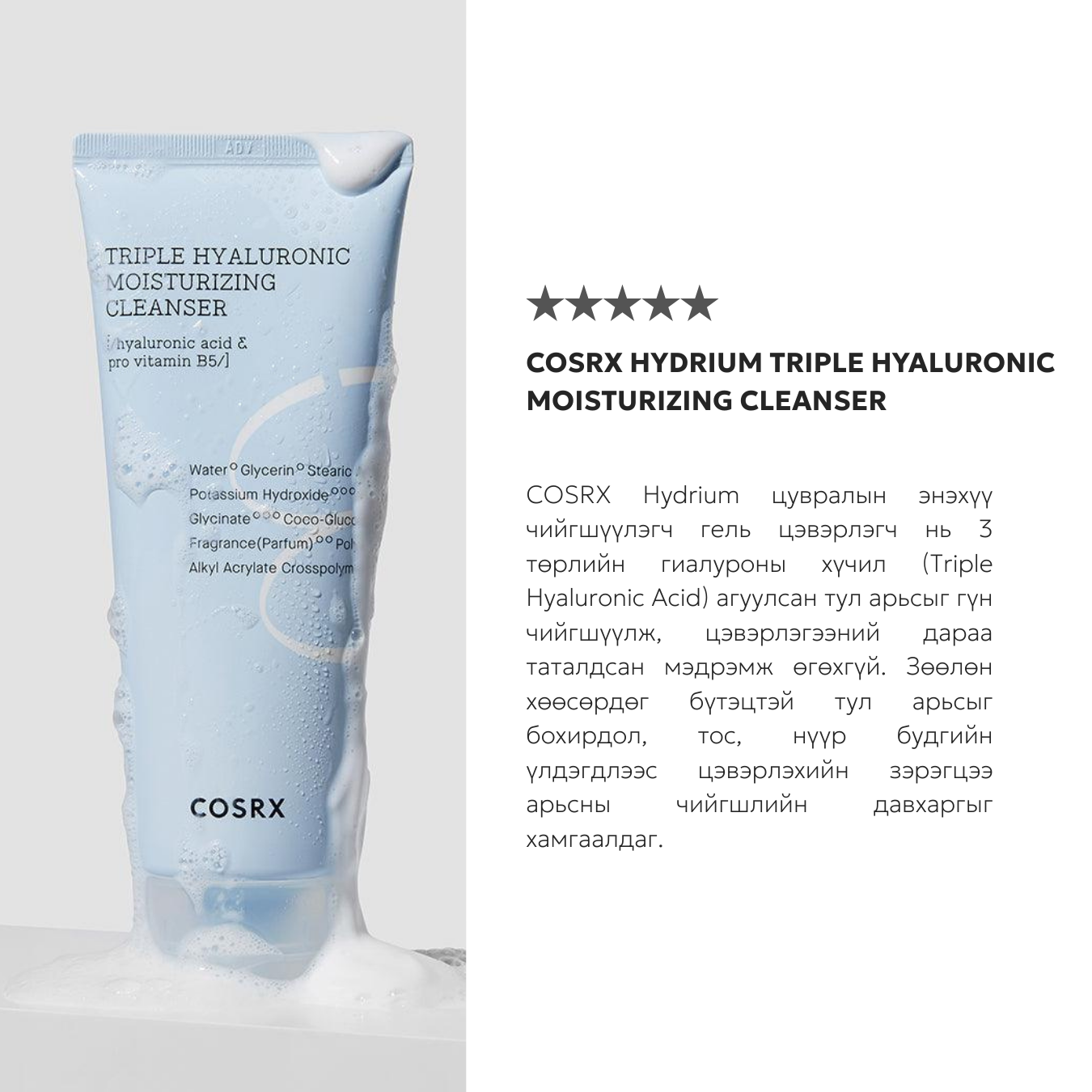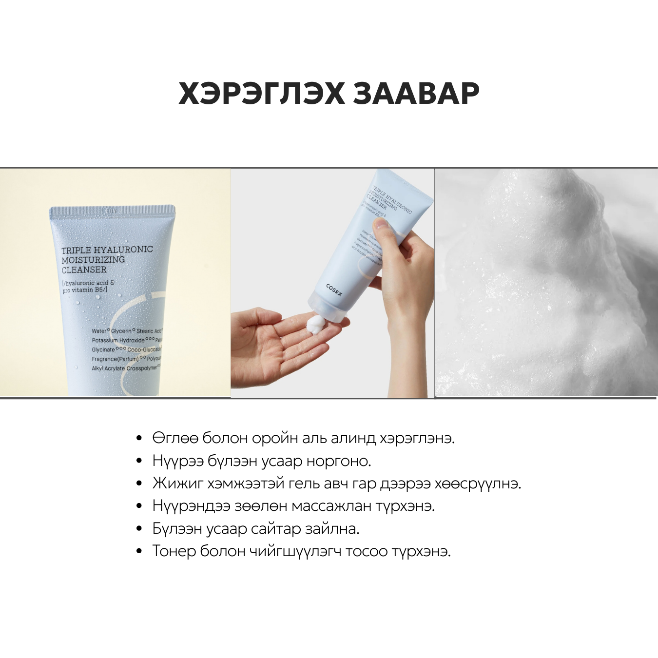 Гүн цэвэрлэж, урт хугацаанд чийгшүүлнэ, Витамин В5 ба 3 төрлийн гиалуроны хүчил нь чийгшүүлэх үйлчилгээтэй.